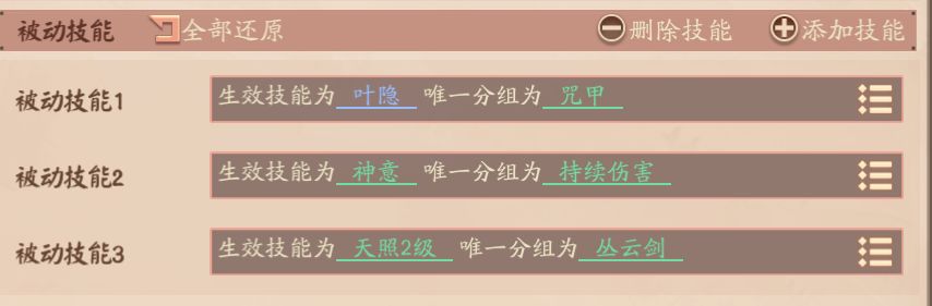 被动技能是可以更改配置的,比如可以给A装备应用B装备的被动技能,技能的个数也可以手动增加/删除。