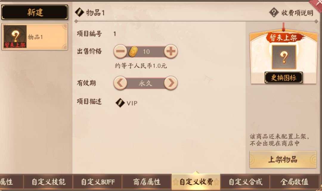 自定义收费页签用来编辑收费项目。可编辑的信息为商品名称、出售价格、有效期、以及商品描述。具体规则如下图所示,值得注意的是,只有地图热度大于10000后才可以上架收费项目。