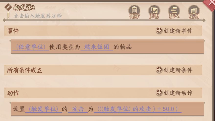 物品的本身的属性分为基础属性、售卖属性、使用属性、执行效果和建造属性。这里是抽取了物品在平安京中的原有效果,比如原本是一个回蓝药,那这个道具在这里的执行效果就是回蓝效果。但是如果想通过使用一个回蓝药实现更多其他的功能,比如吃了一个糯米饭团,使用单位的攻击力+50,这样的效果是通过触发器实现的。
