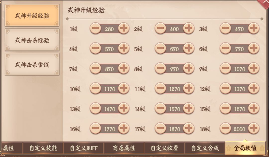 全局数值包括式神升级经验、式神击杀经验和式神击杀金钱。这里的数值是全局数值,也就是所有1级式神的升级经验都为280点。
