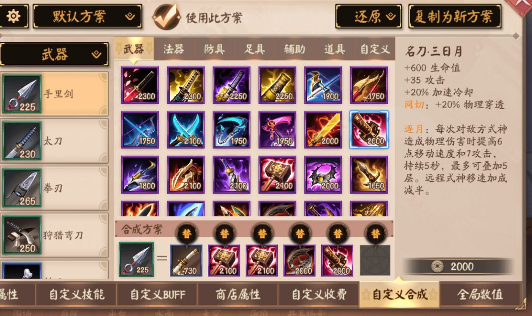 自定义合成页签用来编辑装备的合成方案。可以配置多套不同的合成方案,选择使用此方案后,游戏运行中将以这套方案去合成装备。还原功能可以将已编辑的合成方案还原为初始合成方案。