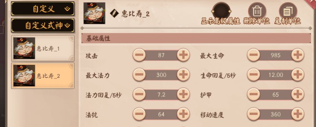 每一个单位右上角都有一个复制单位的功能,复制后的单位将出现在自定义分类下,作为一个新的单位类型。如上图中的惠比寿_1与惠比寿_2在这里就是两种不同的单位类型