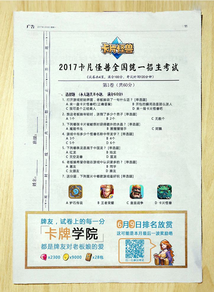 牌友,老板娘喊你参加2017卡片怪兽全国统一招生考试