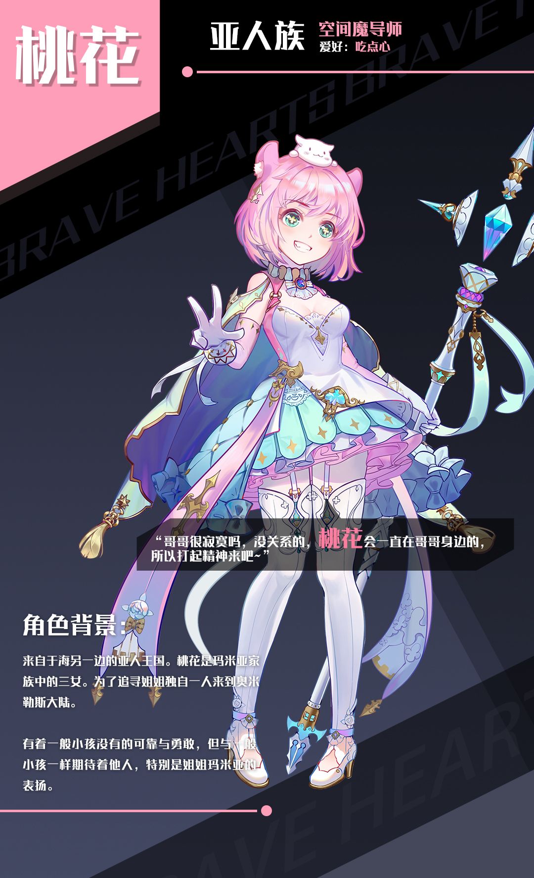 桃花来自于海另一边的亚人王国,是玛米亚家族中的三女,为了追寻姐姐独自一人来到奥米勒斯大陆。