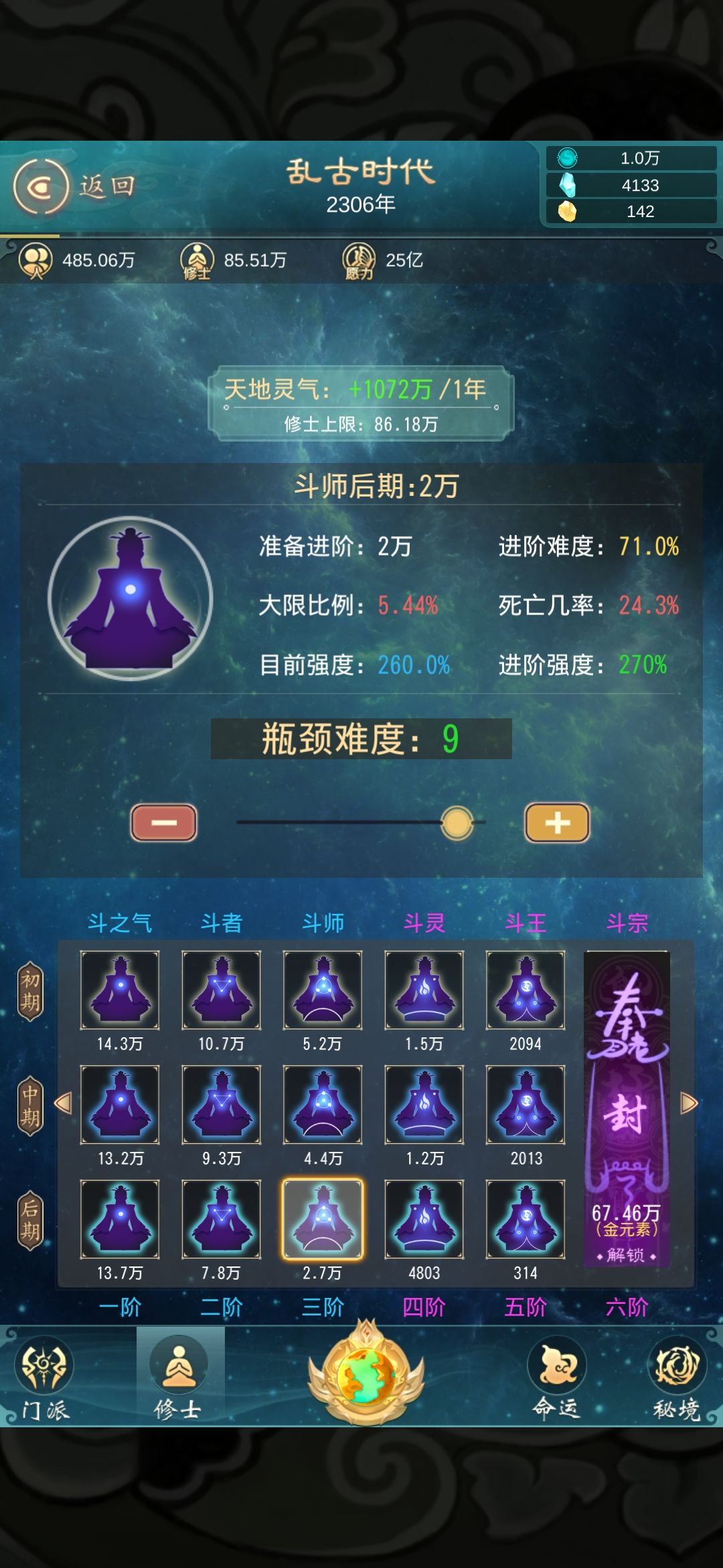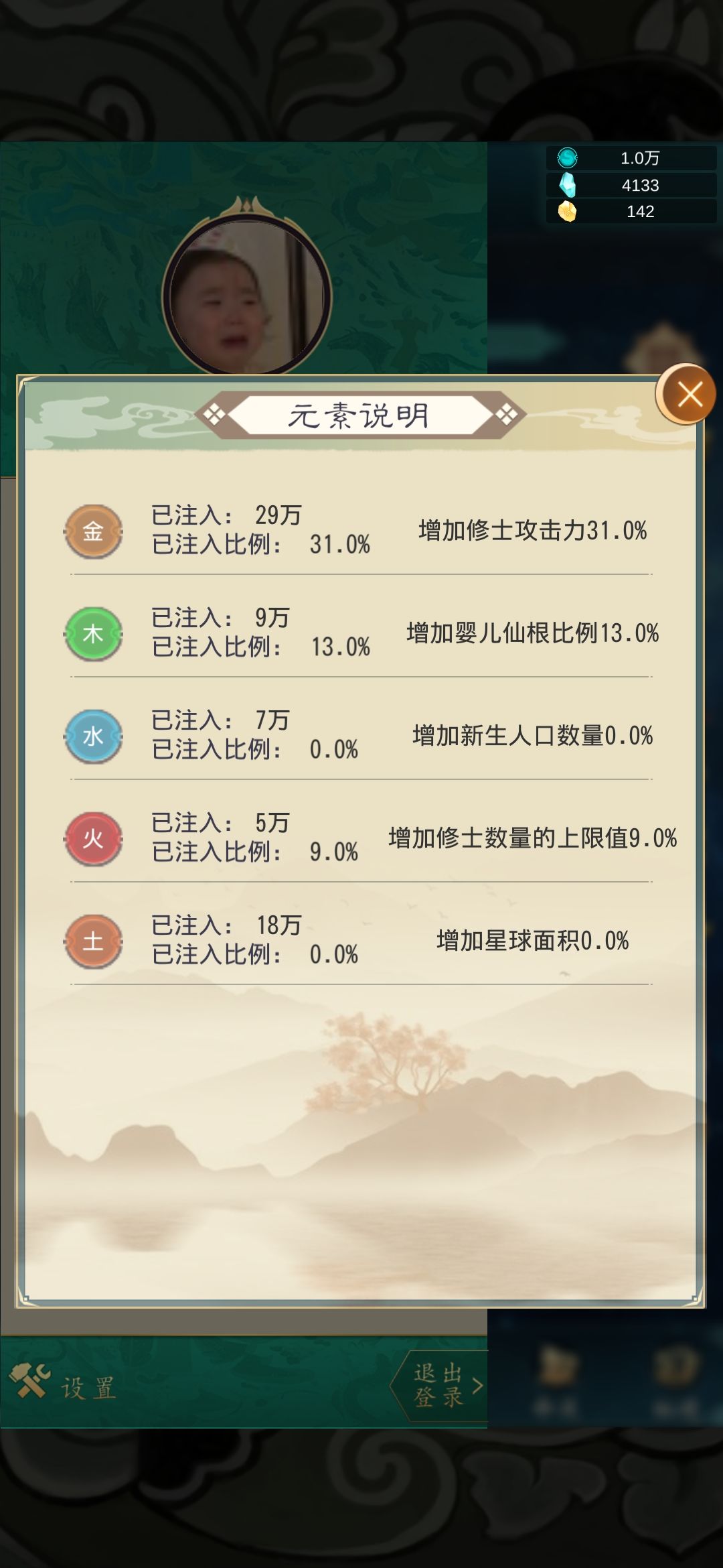游戏玩法大家肯定很容易就看懂了,先说一下我看到的大家碰到的问题,我是怎么解决的:首先就是修士,修士在你的星球不断发展的情况下会越来越多,你注入的金元素的多少决定了修士等级上限,但是总会到了上限不能增长的情况,我是度过了两次天地大劫,修士上限现在是80多万,一旦到了上限新生的修士肯定会减少,所以人数不能会增长,所以可以加大进阶难度来增加修士死亡率,这样就可以不断有新生修士补充进去。