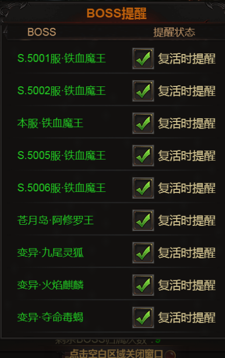 变异BOSS跟跨服BOSS共享归属次数,都可设置BOSS提醒。
