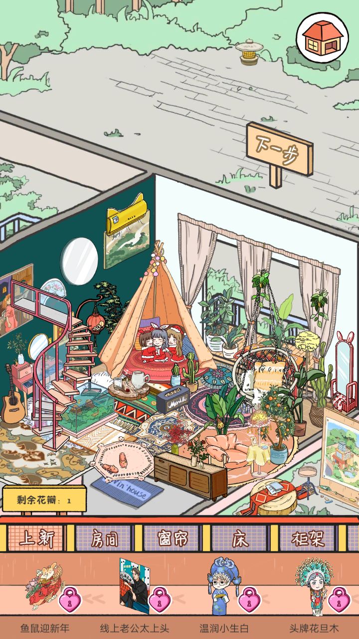 比较喜欢随性的屋子,要有很多绿植,不一定要有床,但一定要有沙发。布置前看了一遍能用的道具,决定不走居家风,而偏向休闲舒适,所以特意将沙发和吊椅区域精心布置,地面用不同的地毯堆叠,营造出慵懒气息,在空余处点缀一些奇妙的小物件,比如鱼缸,仙人掌,电子琴这些,让整体感觉看起来更奇妙。不如意的是左面墙,本想墨绿色更适合中国风,无奈找不到合适搭的物件,加上墙面布置本身要求高,最后看上去有些敷衍。