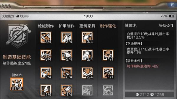 2、武器、护甲制作:这两个方向的技能效果类似,第一个技能都是快速制作,能够缩短武器和半成品的制作时间。第二个技能都是提升生产出来的武器、护甲坚固值,变相提升可维修次数。第三个技能都是精修有概率降低修复消耗,配合上第四个技能枪械、护甲拆解的时候有几率额外获得一个合成材料,可以有效降低生产成本。
