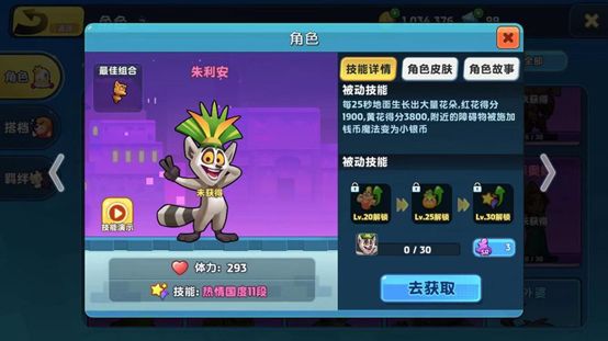 技能详情:每25秒地面长出大量花朵,红花得分1900,黄花得分3800,附近的障碍物被施加钱币魔法变为小银币。