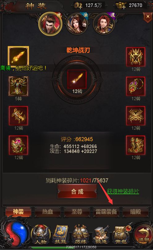 二层七,八阶boss掉落的装备是五七八阶的暗殿装备和暗殿神石其中八阶暗殿boss有几率爆落暗殿装备里的八阶武器或者衣服(注:暗殿装备武器或衣服统一爆落的阶段只能是8阶往后就需要去合成界面合成九阶或者以上等阶的暗殿衣服或者武器)穿戴条件是10转。