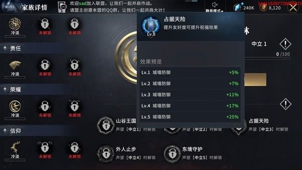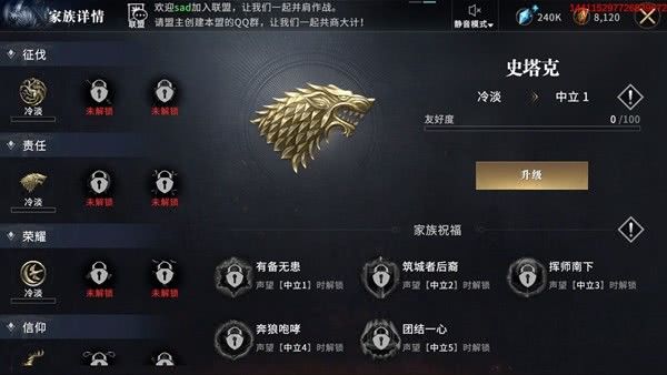 前期以掠夺为主的领主,则建议优先培养史塔克家族,也就是责任线。史塔克家族带来的征讨伤害加成、步兵攻击加成以及全军攻击加成,能让领主在更快的清理周边叛军,收集更多的资源。