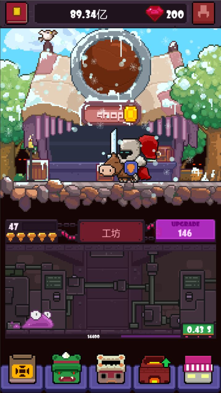 第二款是像素游戏,我主要负责美术并且程序小伙伴一起制作,这个游戏故事灵感来源于想换个角度做描述反派,因为我觉得多数游戏都是正义的人类去打怪,然后获得装备,取得胜利。在这个游戏里,我换了个角度,所有得主角都是怪兽,它们在一个商业头脑很厉害头领的领导下,假扮商人悄悄的做着所谓英雄们的生意,赚取他们的金钱,生产各种武器装备卖给他们,来谋取暴利。在这个游戏里,就是不断的赚钱赚钱赚钱。还是赚钱......游戏的基本框架已经搭完,我们还在做游戏的细节和一些堆量的东西。