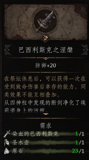 用真圣剑进行修女埃莉诺剧情,获得【染血的巴西利斯克】和【染血的遗书】。