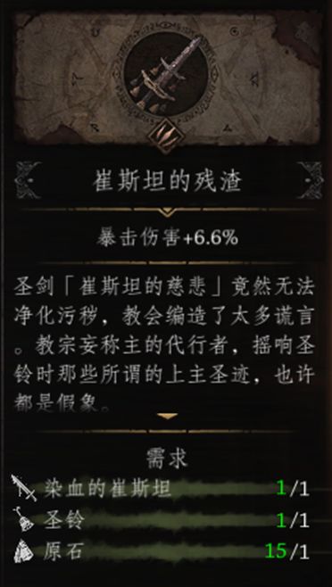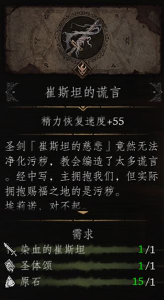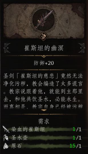 如果选择使用【崔斯特的慈悲】,会发现感染了污秽的修女并未被杀死,而转化为小怪,击杀后仍会掉落【染血的遗书】。背包中出现【染血的崔斯坦】。