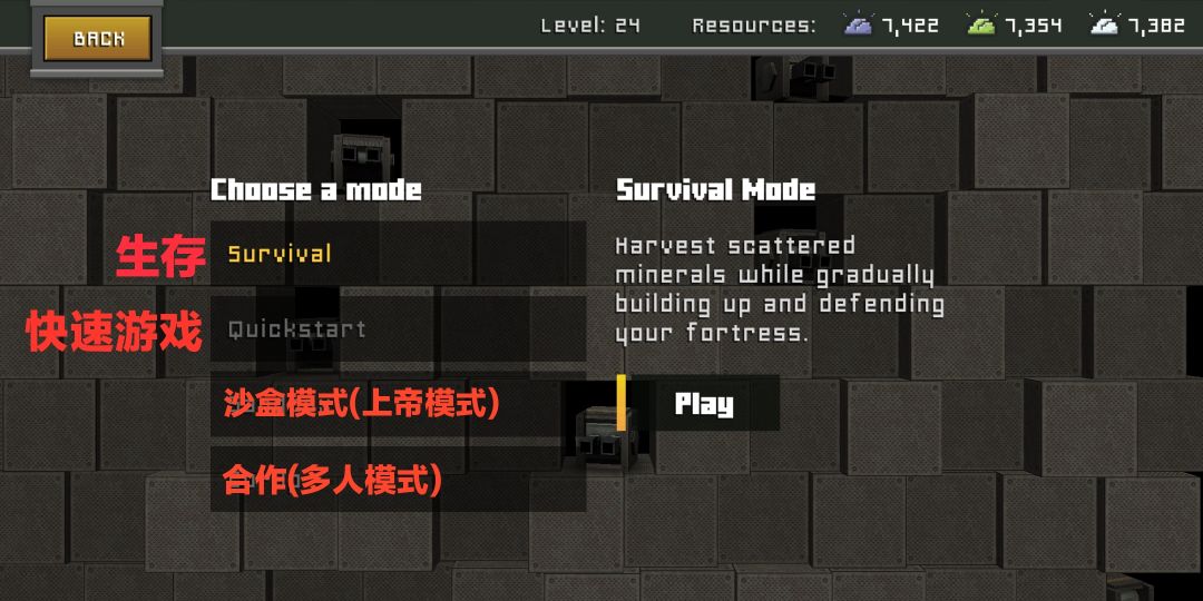 Sandbox(沙盒模式)也就是无限资源(上帝模式)刚入手的小伙伴可以从这个模式入手(之前我搞错了,还以为快速游戏好入手,自己玩了玩发现连五分钟都没撑过 因为我什么都没建造,就建了个电钻)