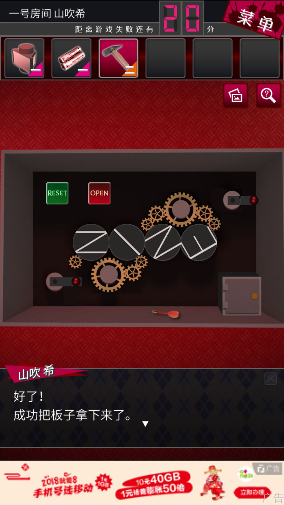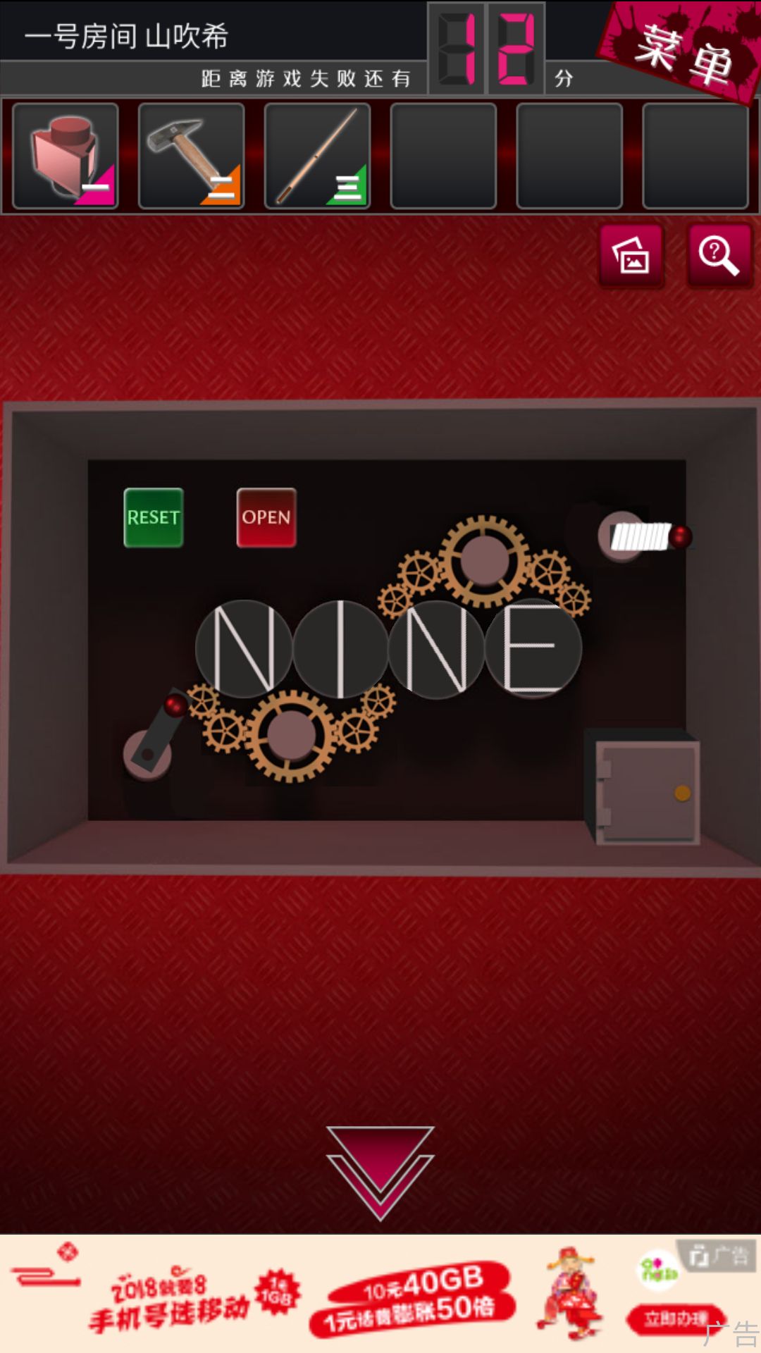 来到板前,装上齿轮和纱布,转动两边力臂,调整字母得到“NINE”,再点击“OPEN”,获得钥匙。