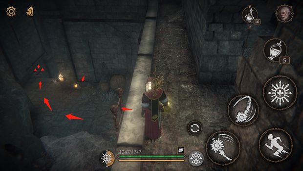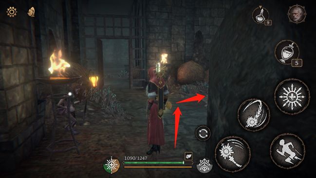 七、往下探索开启机关放另外一个囚牢下去,随后从堆叠空牢笼的洞口出发,不理会左侧的火猪。靠右侧走进入门洞。