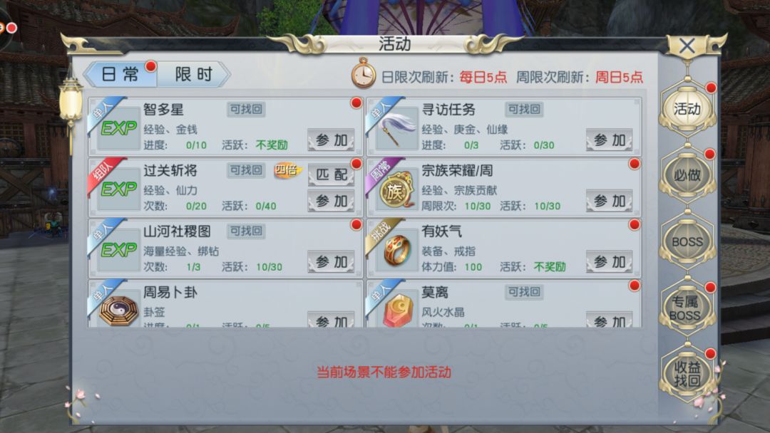 可以大量获得经验的副本:山河社稷图、寻仙任务、过关斩将、智多星、宗族荣耀寻访任务、灵气挂机、宗族聚餐等,其中过关斩前十次将有四倍经验获得哦!但是如果几天没有能上线怎么办呢?没关系,以上任务基本都可以花费一定的金币或绑钻找回基本的经验奖励哦~但是最好还是每天登录游戏做任务获取的经验奖励才是最丰厚的哦!