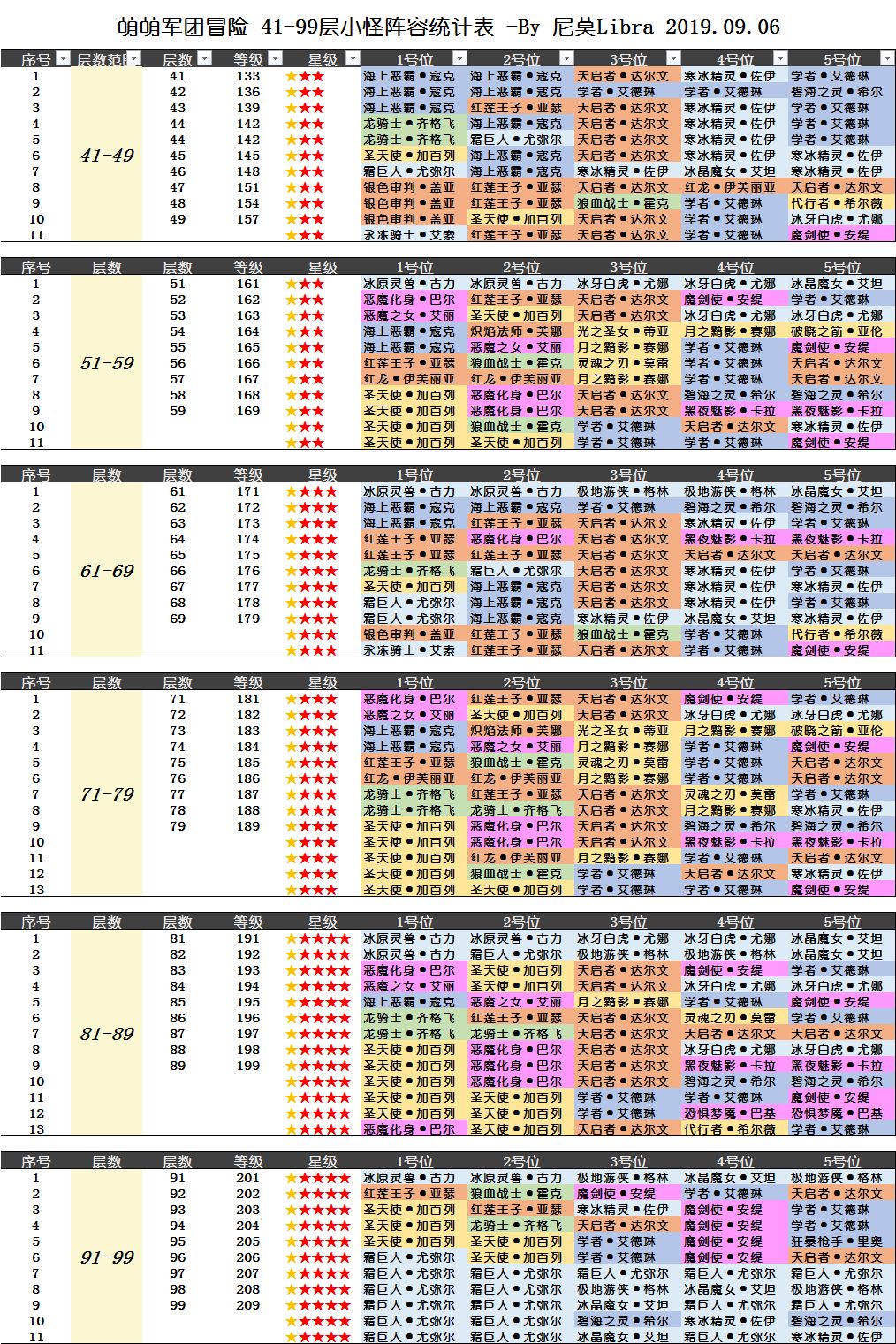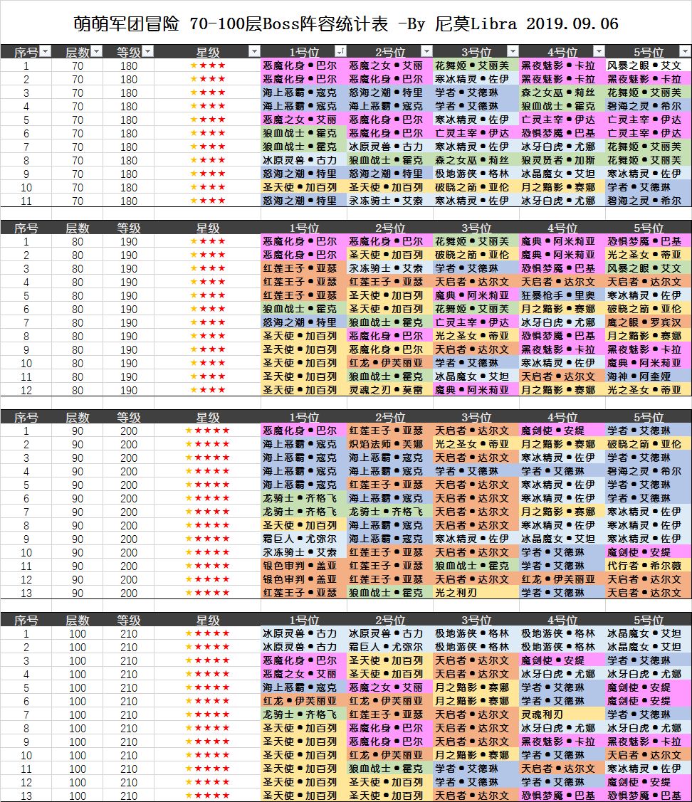 我把怪物阵容列出来,请大家自己去选择自己适合打的对象,为了方便新人,所有怪物按照种族涂色。