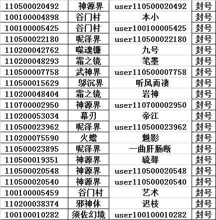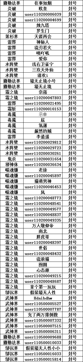 玩家老爷们大家好,我们核查并封停处理了许多篡改数据的玩家,现公布第一批玩家名单。官方提示:请勿相信非法代充、代改或者购买非法账号,使用修改工具,一经发现就用封停删档。希望大家共同监督,公平游戏环境。