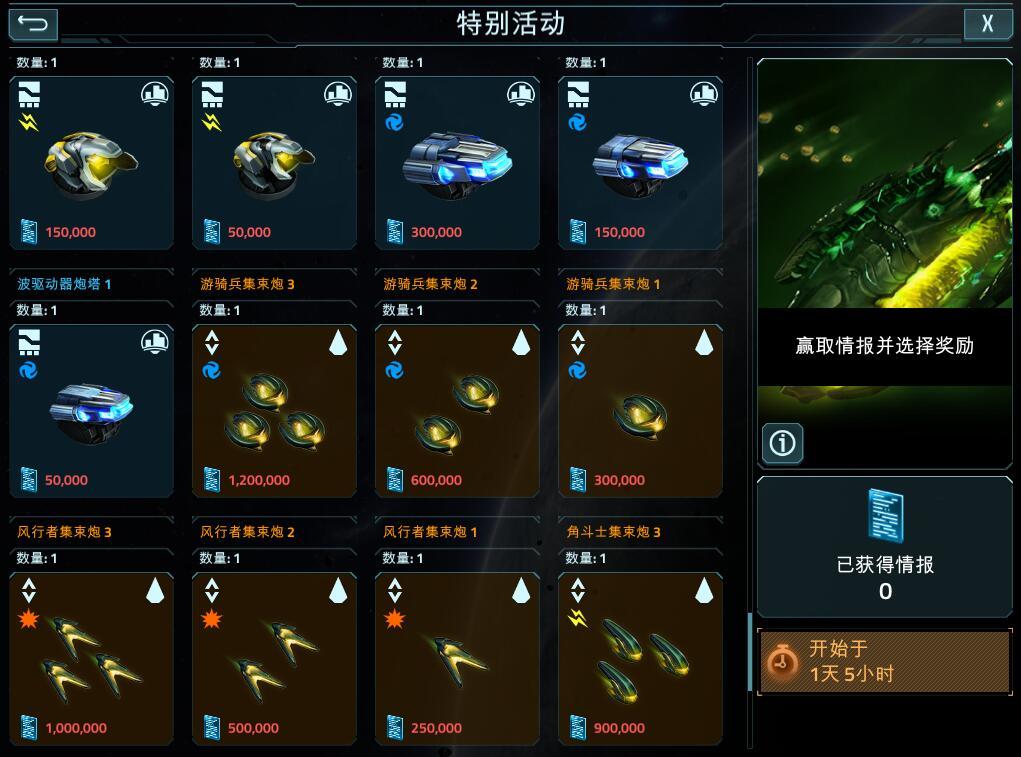 活动时间2018-6-15 9:00正式开始,2018-6-19 9:00结束,特别行动期间,星球将放出27-55级恶魔军团破坏者单人舰队、60-70级未知蜂巢单人舰队、60-70级未知蜂巢双人舰队与70-78级巨型单人蜂巢舰队,玩家击败后可获得相应积分情报奖励。具体舰队分数如下: