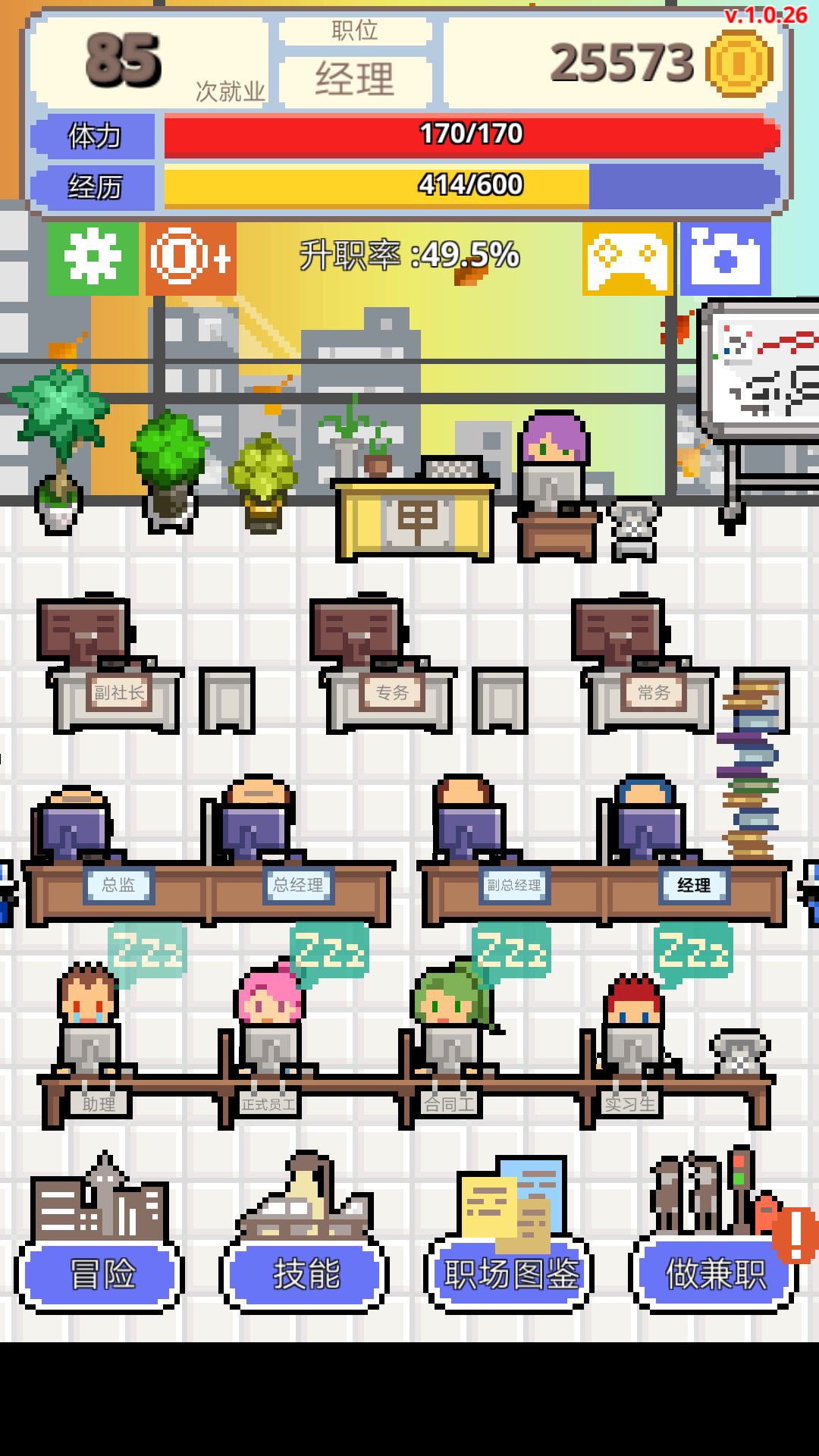 这个是85次的结果,最高升到过总经理,冒险的时候被开了。感觉到社长基本不可能,后面几个职位的概率太低了,冒险不成功很容易就挂了。