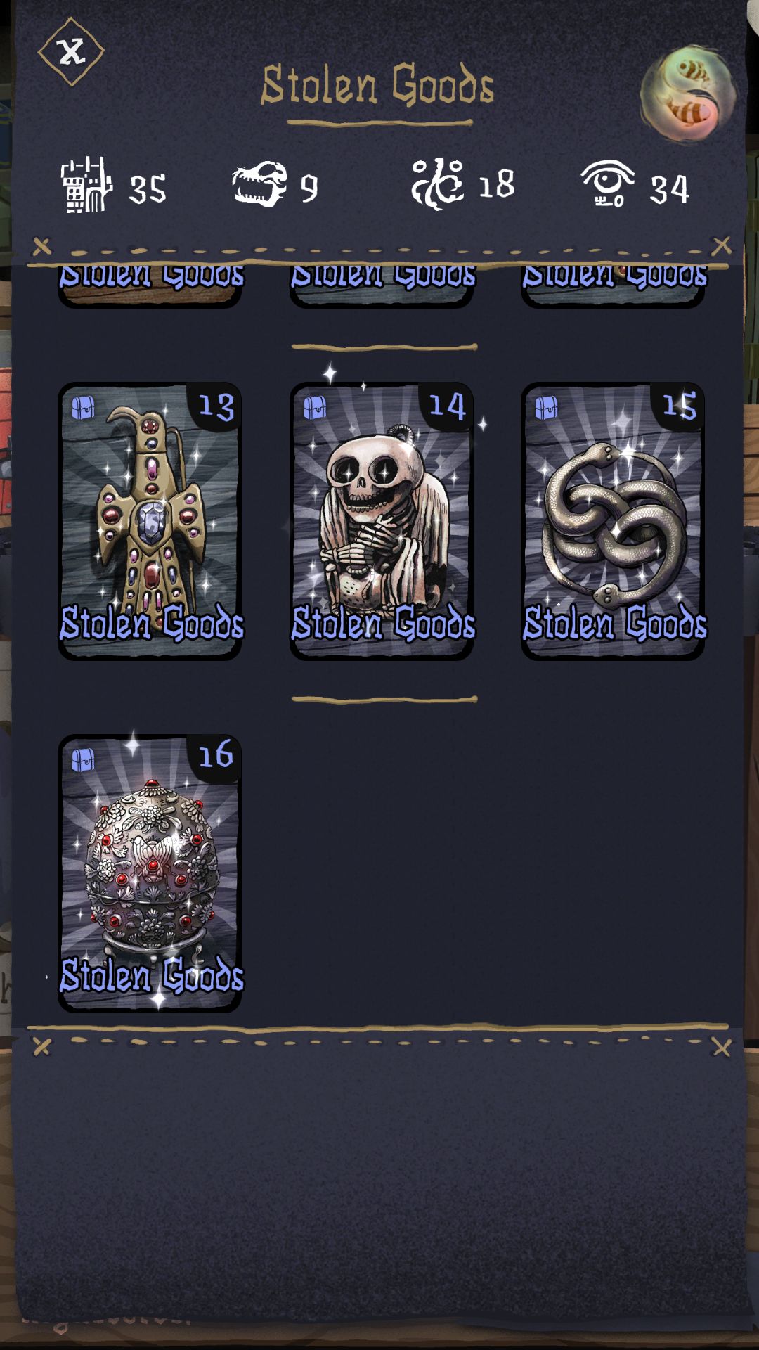 此时界面会出现三张如下图所示的纸片,代表三个不同的盗贼(点击手型符号👈左右翻)。如果赃物满足右上方黑板上给出的条件即可招募新的盗贼(满足条件时右方会出现一团红章泥,点击章泥即可解锁新的盗贼)
