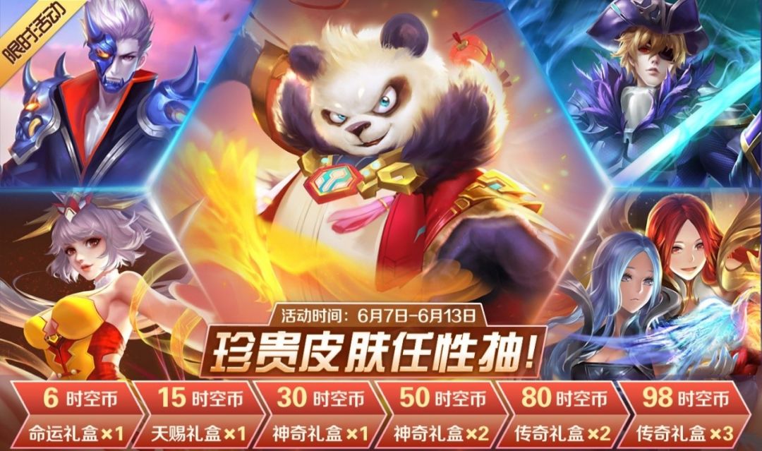 版本更新后,6月7日-6月13日开启限时时空币活动,每充值1元即可获得1时空币,使用时空币可兑换命运礼盒、天赐礼盒、神奇礼盒、传奇礼盒,开启礼盒有机会获得烈焰旋风、创世朱雀、合金赤影等珍贵皮肤!