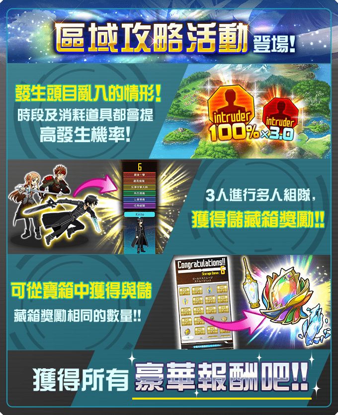 ※區域攻略活動中,不會出現破關一般任務後出現的3個寶箱報酬。