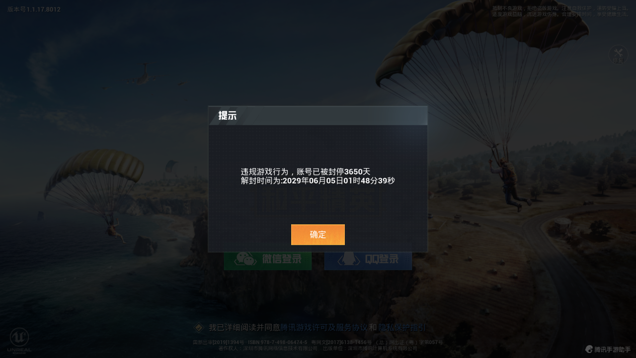 本人在腾讯手游助手使用微信账号登录与小伙伴一同玩和平精英游戏,严格按照游戏要求正常游戏,2019年6月8日凌晨与朋友们游戏后,当日上午11点多再次打开游戏时提示“违规游戏行为,账号已经被封停3650天”。特来申述。