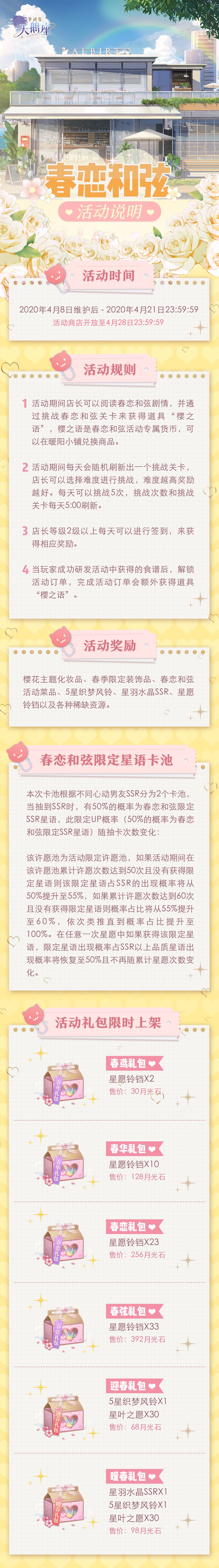 ★『春恋和弦』主题活动奖励:樱花主题化妆品、春季限定装饰品、春恋和弦活动菜品、5星织梦风铃、星羽水晶SSR、星愿铃铛以及各种稀缺资源。
