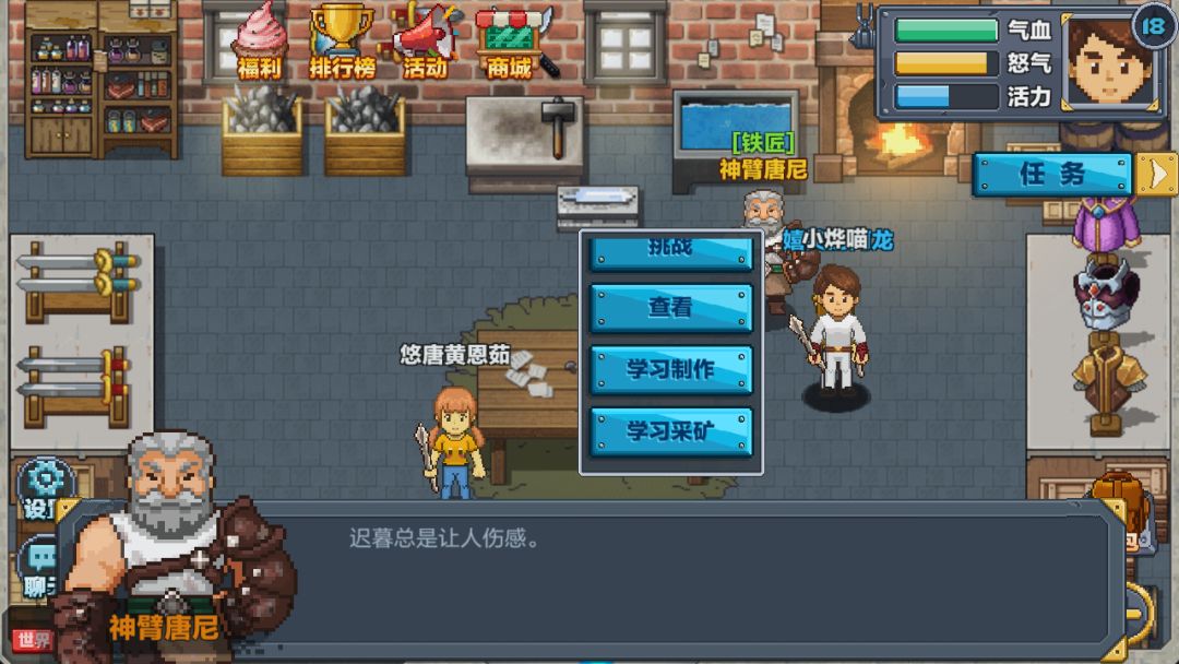 这个容易,在铁匠铺学完挖矿后,就可以打开世界地图去矿洞挖矿,矿洞有好几层,因为龙君懒,才到第二层。
