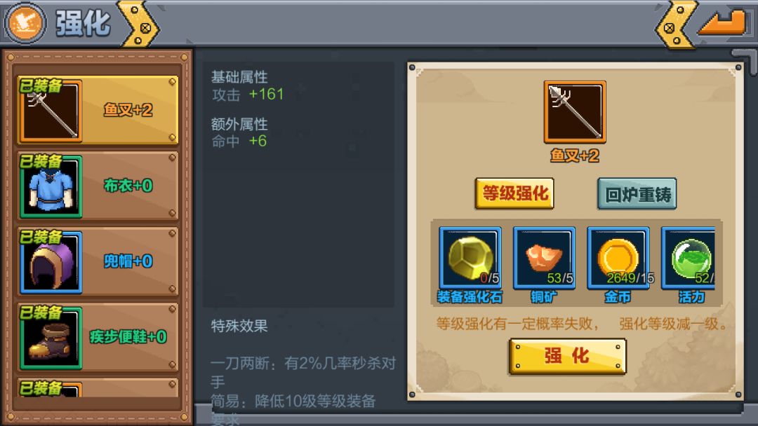 战斗力也是关键,所以玩家记得加点(点击头像框,按加点,分配点数),有了装备石后,就给武器升级,没有附加属性的赶紧回炉重造