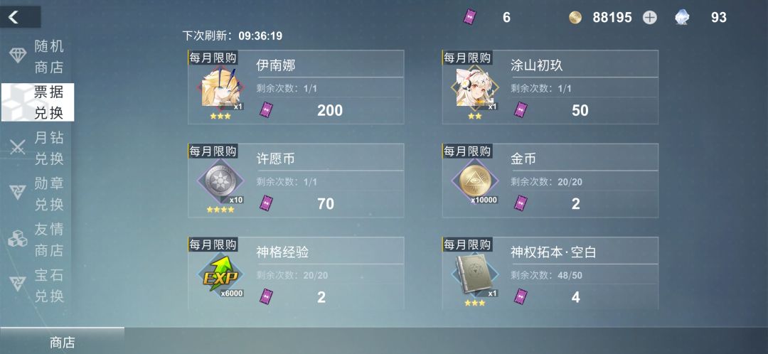 2.抽出来重复的神格才送票据,珍惜度无需多言,由于兽魂紧缺,建议买兽魂,有需要可以买技能升级书。许愿币每次购买都会比上一次便宜一些,比如第一次买是10票据1个,第二第三次就是18票据2个,图中是40票据5个,不建议买,避免上头。