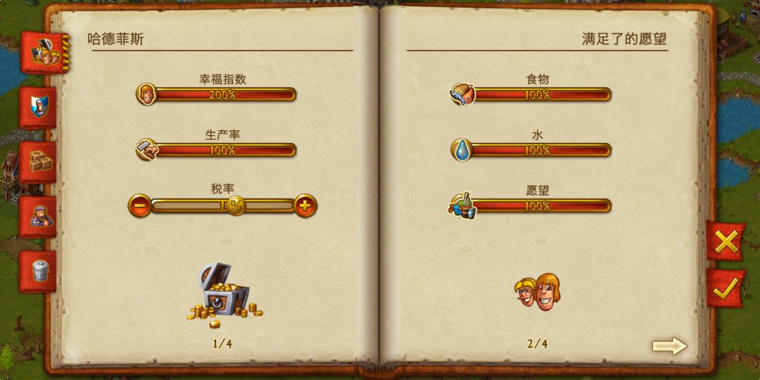 ※前期,先做3渔屋(只需要10木头+100金币,消耗小,记住前期资源紧缺别升级建筑),满足居民粮食需求。