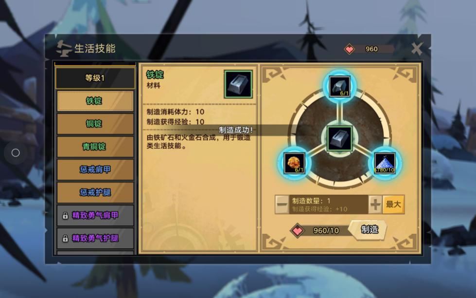 首先,在这里的生活技能所指的便是勇士的锻造技能,通过材料的合成制造更加强大的武器和防具,从而实现战斗力的飞速增长。每个人根据完成锻造品的数量不同,便会获得不同的锻造经验,锻造等级越高所学会的配方也就越多,制造的成品也就越强大。真正的锻造大师所制造的极品装备必然是数不胜数的。锻造升级需要一定的材料,其中包括铜矿石、火焰草、强韧草、灵麻草、魔心草、火金石。这些材料需要玩家在日常游戏过程中采集收集,都是非常容易获得的材料,此外,升级之后还需要配方才能解锁对应的锻造能力,所以想要成为一名锻造大师是一个日积月累的过程哦~