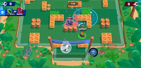 尽管这组的中场较空旷,但球门附近的掩体还是对进球有很大限制,所以在中场取得优势后,不要吝啬传球,哪怕是用大招传球,也要尽快将球送到离对方球门更近的健康队友脚下,趁敌方缺人完成进球,打的就是时间差。