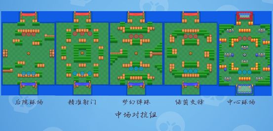 这组地图都是中场区域较为空旷的地图,通过在中场对抗决出优势,进而向球门进发。由于缺少硬性掩体,对于近战英雄来说,草丛就显得很关键,可以在草丛中埋伏起来等待时机进攻,或是进行伏击打防反战术。