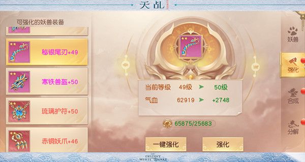 妖兽觉醒之后,我们还可通过特殊的妖兽装备提升属性。无论是妖兽装备的获取、强化还是合成,玩家都可配合个人喜好将妖兽培养成自己专属的独特伙伴,共同迎接《天乩》手游浩大仙侠世界中的重重考验。