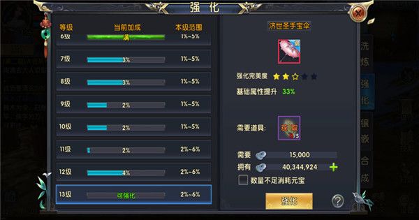 强化是从游戏初期就能开始提升战斗力的玩法,强化属性直接加到人物身上,可以强化装备的基础属性。强化等级越高,增加的战斗力也就越多。装备强化需要少侠们每天慢慢的积累强化石来完成。每件装备的最大强化等级为十六级,但是每级又有强化加成,强化加成越高装备属性也就越好,系统会根据强化完美度赋予装备不同的星级,相当于二次强化。在这里建议玩家把每一级强化加成值都提升到最大,这样属性才不会差。