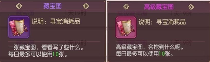 挖宝所需材料:藏宝图(紫色藏宝图、粉色高级藏宝图),每种每天均可使用10次;