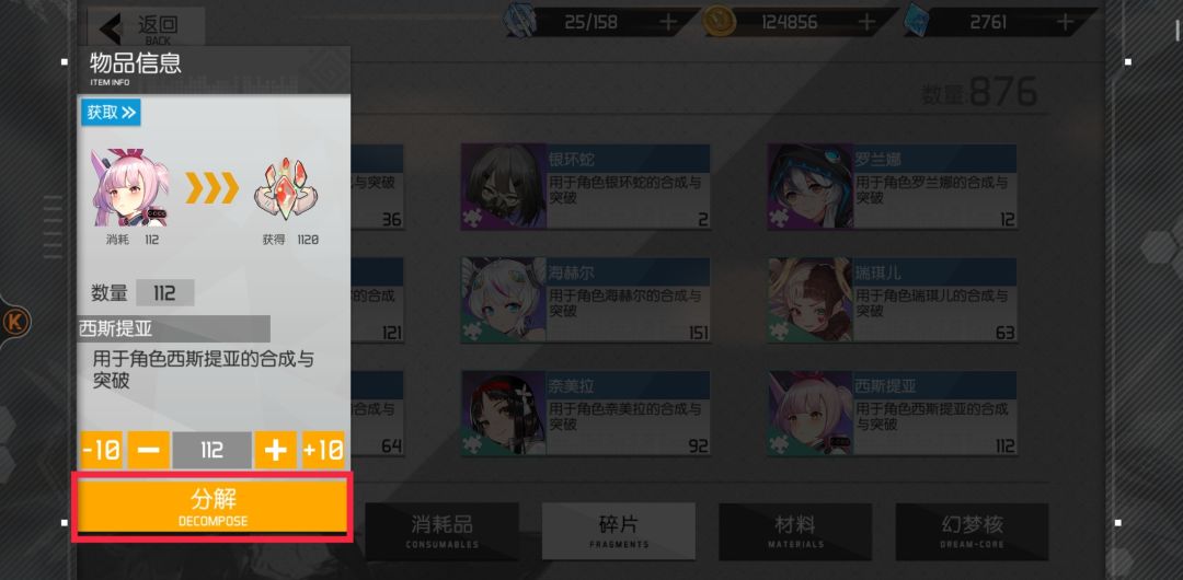 第一就是碎片分解,仓库几百上千个R卡碎片用不着的通通分解,讨厌的SR、抽歪想泄愤的卡也分解了。资源少的豹子头非酋们一定要慎重考虑好自己的阵容,把想要主力培养的ur确认好后在精粹兑换页面换碎片升星。