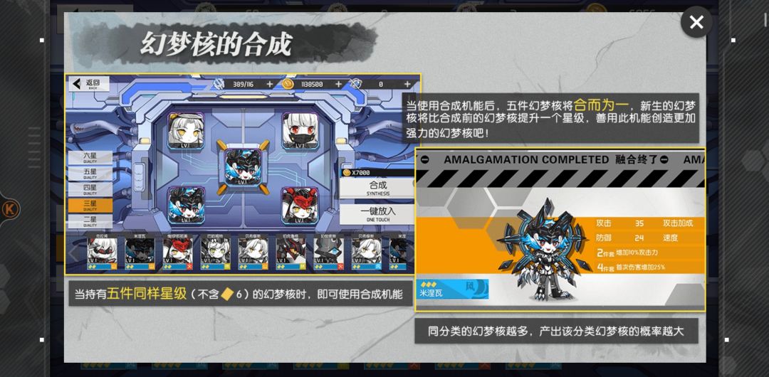 第二是幻梦核合成,五个低星合成一个高星,权重越高越有可能合成出这个词缀的幻梦核。幻梦核没成套的可以把那些不用的拿来合成而不是当狗粮,幻梦核强化还是得刷狗粮,直接用幻梦核给的经验太少了。