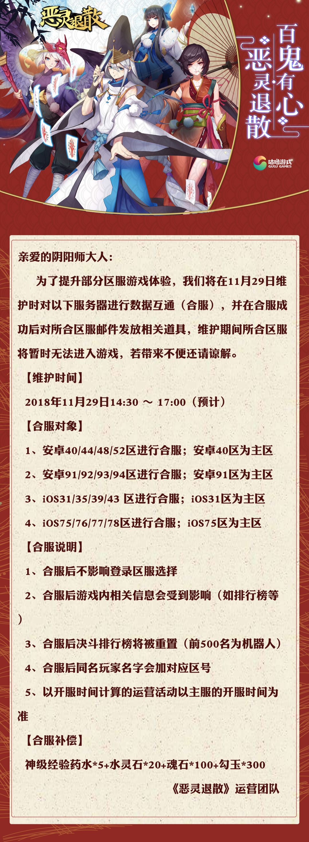 为了提升部分区服游戏体验,我们将在11月29日维护时对以下服务器进行数据互通(合服),并在合服成功后对所合区服邮件发放相关道具,维护期间所合区服将暂时无法进入游戏,若带来不便还请谅解。