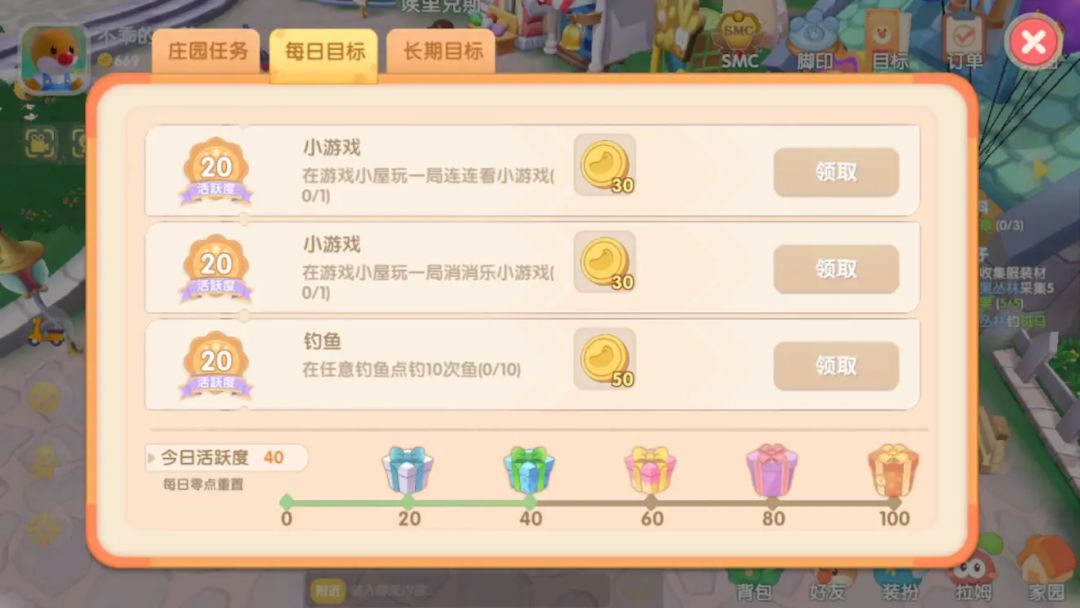 每日目标每天都要坚持完成,规划路线如下:到梅森处购买肥料*1,鱼饵*30,茄子种子*10,之后到白熊游戏屋玩玩两款小游戏,然后朝着雪山方向进发,到两个骑士旁边的雪山钓鱼场垂钓5~10次,垂钓完后进入洞穴去浆果丛林垂钓5~10次,采集黄色浆果*10、红色浆果*10,然后回到家园中播种茄子,施肥、浇水、垂钓5~10次,完成3个订单,一日任务就这样完成。任务奖励除了摩尔豆之外还可以获得金豆*30,到丝尔特姐姐那里购买青蛙王子一套,增加大量魅力,而且还很可爱(强烈建议首日先把青蛙王子套的荷叶伞买了)。