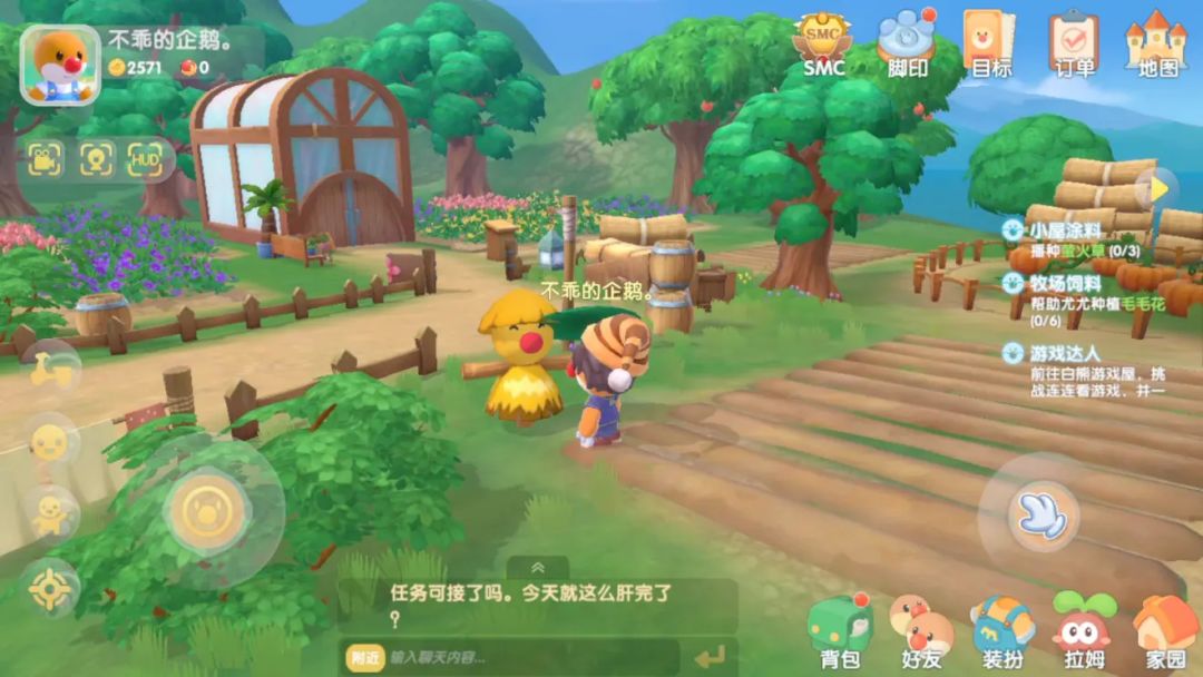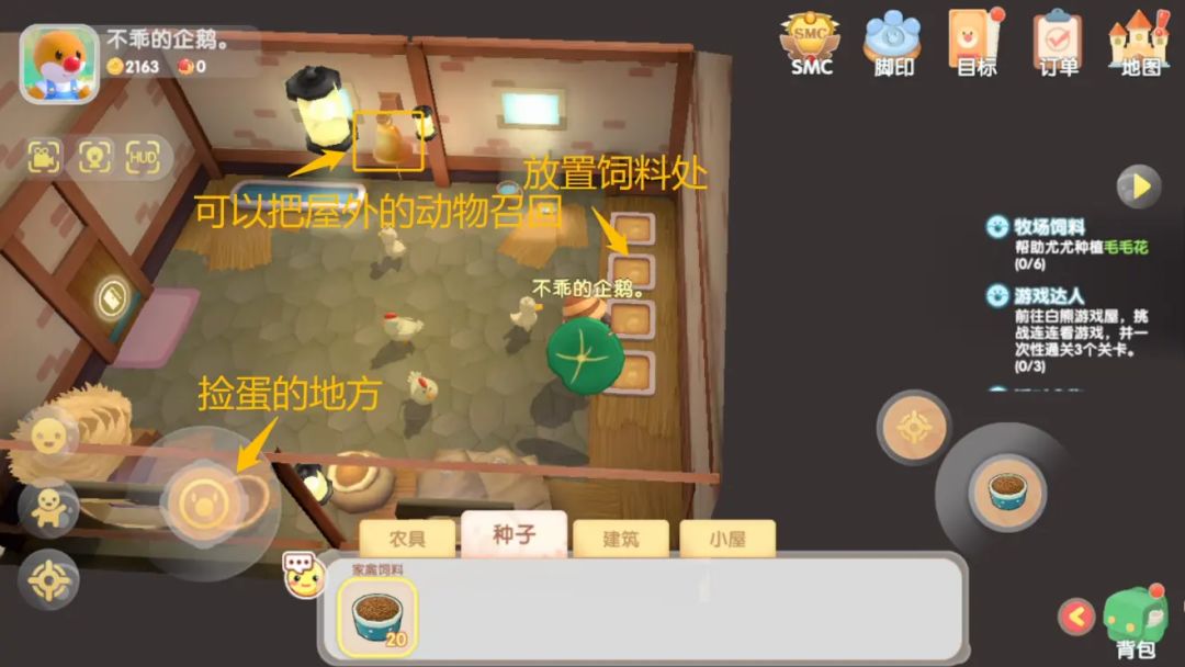 农场主升级到14级后,终于开启了动物养殖,画面右边的目标导引处会出现“建造鸡舍”的新目标,我们要到汤米(爱心教堂左边,寻路可达)那里花费50摩尔豆,30木头,20石头,5杂草建立鸡舍,因为这里距离补充材料的家园或者开心农场都比较远,建议先把材料备齐后再来。确认建造后右下角选择家园回家和汤米对话,正式开始动工。这里建议先出存好500以上摩尔豆,因为牧场主尤尤会在目前的剧情中唯一一次造访我们的鸡舍,为我们庆贺畜牧业开张,赠送我们几个饲料,我们可以趁此机会买向她两只小鸡和两只小鸭,并按经济实力买多几份饲料备好,小动物消耗饲料的速度还是挺快的,大概一个多小时就会吃一份。关于小鸡和小鸭买哪个好,其实感觉都没什么区别,只是小鸭成熟期和产蛋期会更长,家禽饥饿就不会产蛋,意味着鸭子要消耗更多的饲料,成本也很高,但回报肯定会更高。具体回报要怎么体现呢,鸭蛋和鸡蛋都是订单素材之一,当然是靠接订单来体现了。