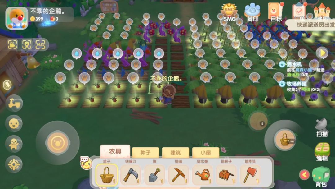 此时有两个非常重要的任务必须及早完成,第一个是彩虹姐姐任务“走失的拉姆”(不知是否需完成前置任务采集浆果),第二则是向导杰西提供小电驴的任务,都只是简单的跑腿任务,但是提供的奖励回报十分丰厚,对前期帮助很大:一个是我们最爱的可爱的拉姆(颜色随机,拉姆成长需要时间,每两小时可以为拉姆浇一次水,最快16小时可以脱离花盆跟我们外出),一个是小电驴(坐骑,帮助我们在庄园里风驰电掣,加快跑路速度)。 很多npc的任务都需要先完成一个再刷新下一个,如果不是 种植/养殖这些可能会卡人的任务,就不要嫌麻烦,赶紧跑腿做了。同时种植/养殖任务容易卡壳也提醒我们时刻注意提升自己的农场主等级,解锁更多的种子,别因为扩列太好玩,钓鱼太好玩就忘了劳动。