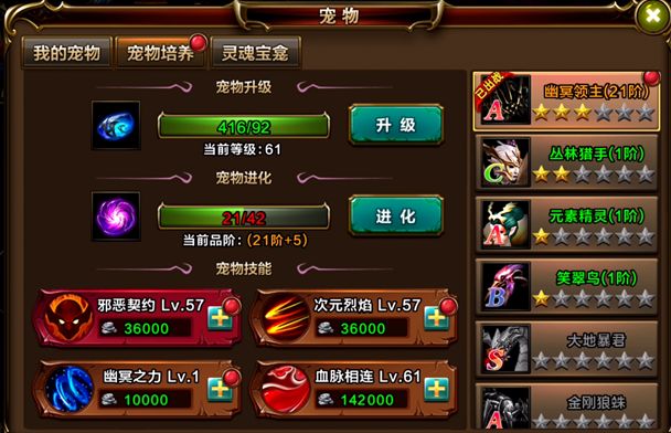 游戏内玩家可携带一个可爱的萌宠与自己并肩作战,每只宠物均可进行升级、进阶、升星的操作,且每只宠物均有自身独一无二的技能可以升级。努力培育一只极品高阶高星宠物与自己并肩作战是提升战力,改变战斗结果极为有效的途径。