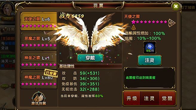 游戏内玩家收集一定数量的凤凰羽毛可激活羽翼系统,每只羽翼均有升级、注灵等培养方法。携带高级羽翼能提升较多战力,未携带的羽翼也能给玩家带来一定的属性加成哦。尤其让人激动的是每只羽翼在达到一定的完美星级时会有非常绚丽的特效外观,冒险者们努力奋斗吧,顶级炫光的羽翼在等你飞。