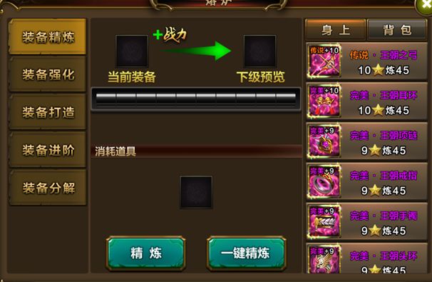 熔炉里有装备强化、装备精炼、装备进阶、装备熔炼、装备传承等各种培养方法: